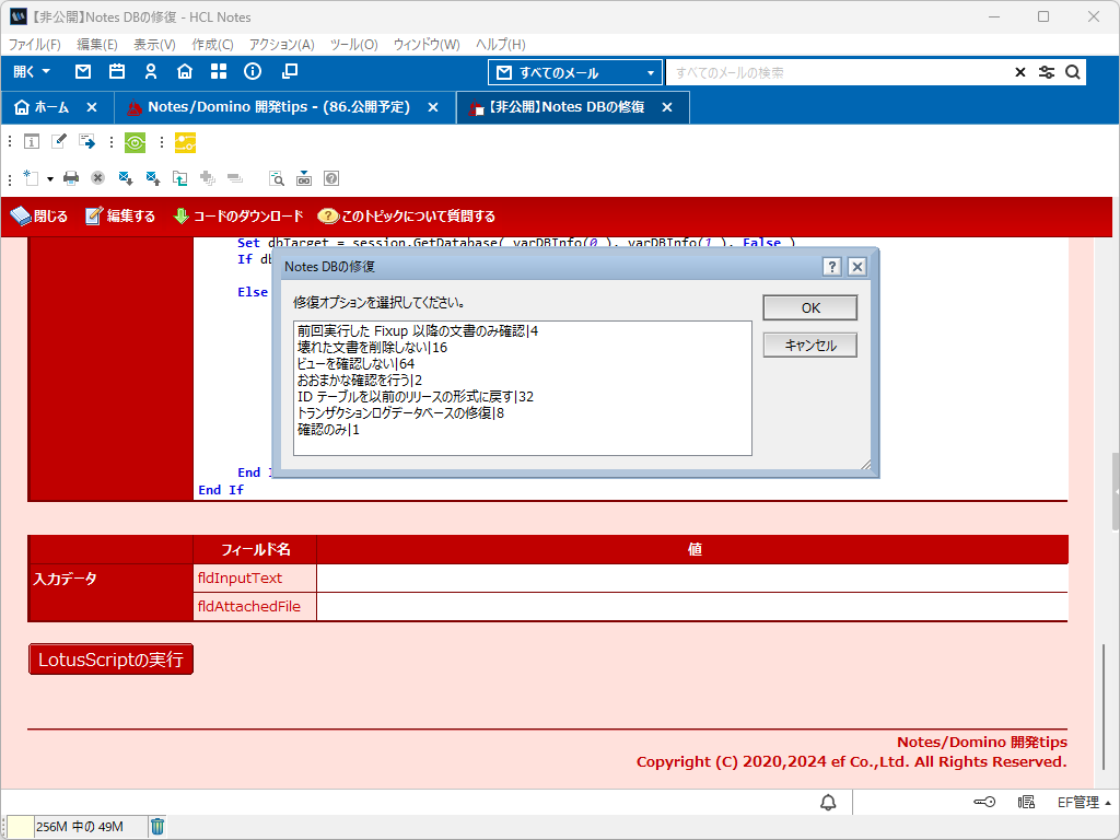プログラムと言ってもドミノディレクトリの「プログラム文書」の事ではありません。ここではLotusScriptを使ってNotes DBを修復する方法についてを指します。