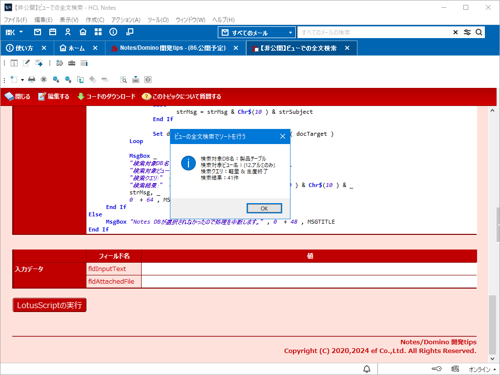 サンプルコードはNotes DB、ビュー、検索クエリを設定して実行するとそのビューで全文検索を行い、結果が何件あったのかと言うことを画面に表示するというものです。