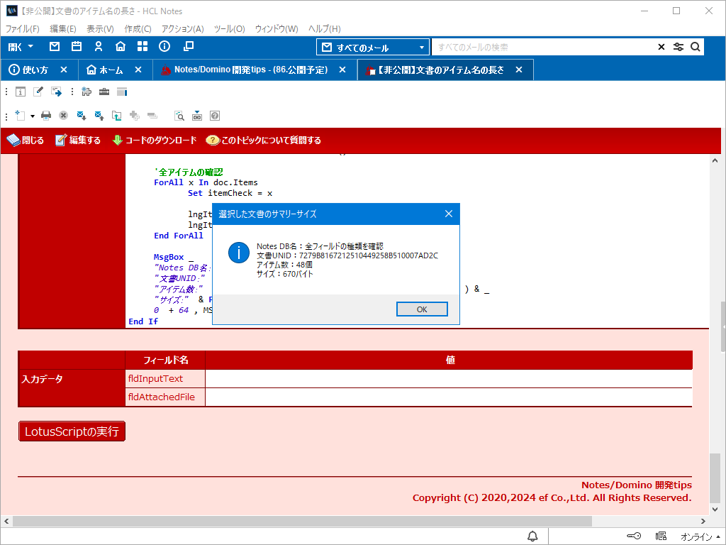 サンプルコードは選択した文書内の全アイテム名の長さを算出して結果を画面に表示するというものです。文書のアイテムということで「$UpdatedBy」のような予約アイテムも含まれます。